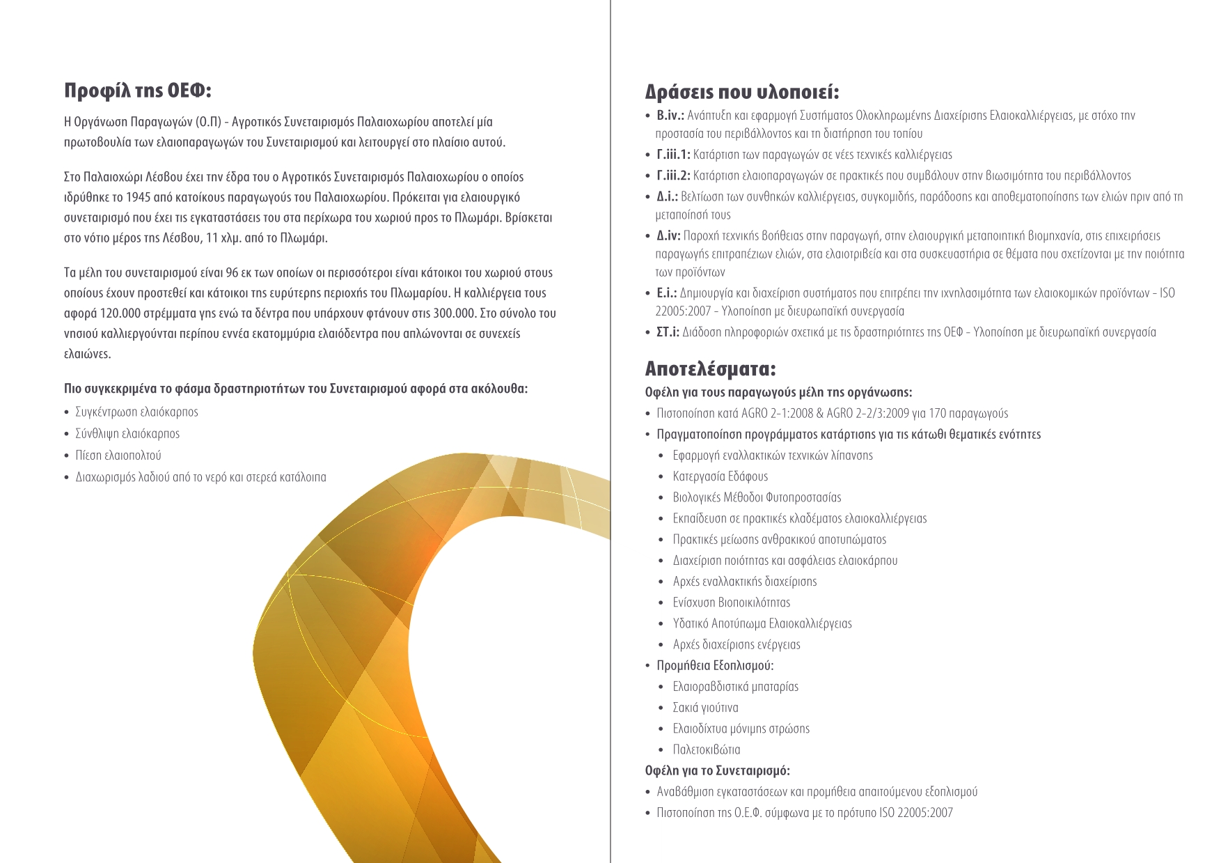 - Τομέας (Δ): Βελτίωση της ποιότητας της παραγωγής ελαιολάδου και επιτραπέζιων ελιών,